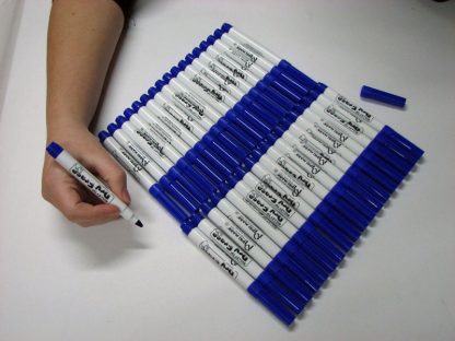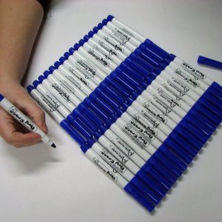 Blue dry-erase marker, non toxic, low odor, wipes off with dry cloths, and usable on white boards. Also available in other colors. Quantity discounts available.