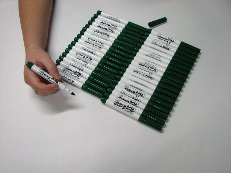 Green dry-erase marker, non toxic, low odor, wipes off with dry cloths, and useable on white boards. Also available in other colors. Quantity discounts available.