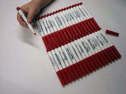 Red dry-erase marker, non toxic, low odor, wipes off with dry cloths, and usable on white boards. Also available in other colors. Quantity discounts available.