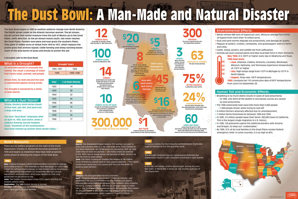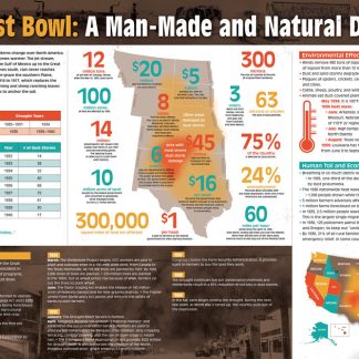 The Dust Bowl and the Great Depression were the one-two punch of the 1930s. What caused the Dust Bowl? What happened to the people, and the environment? How did the government respond? The dynamic infographic is packed with facts about: Environmental cause and effects Human toll and the economic consequences Government relief efforts to fight the Dust Bowl Context for an American environmental disaster, and morespan style=”color:#FF0000;”Download the PDF of free sources with links located in ;ldquo;Additional Info.;rdquo;/spanCopyright 2019. Middle school, high school. 36 x 24 inches. Laminated.