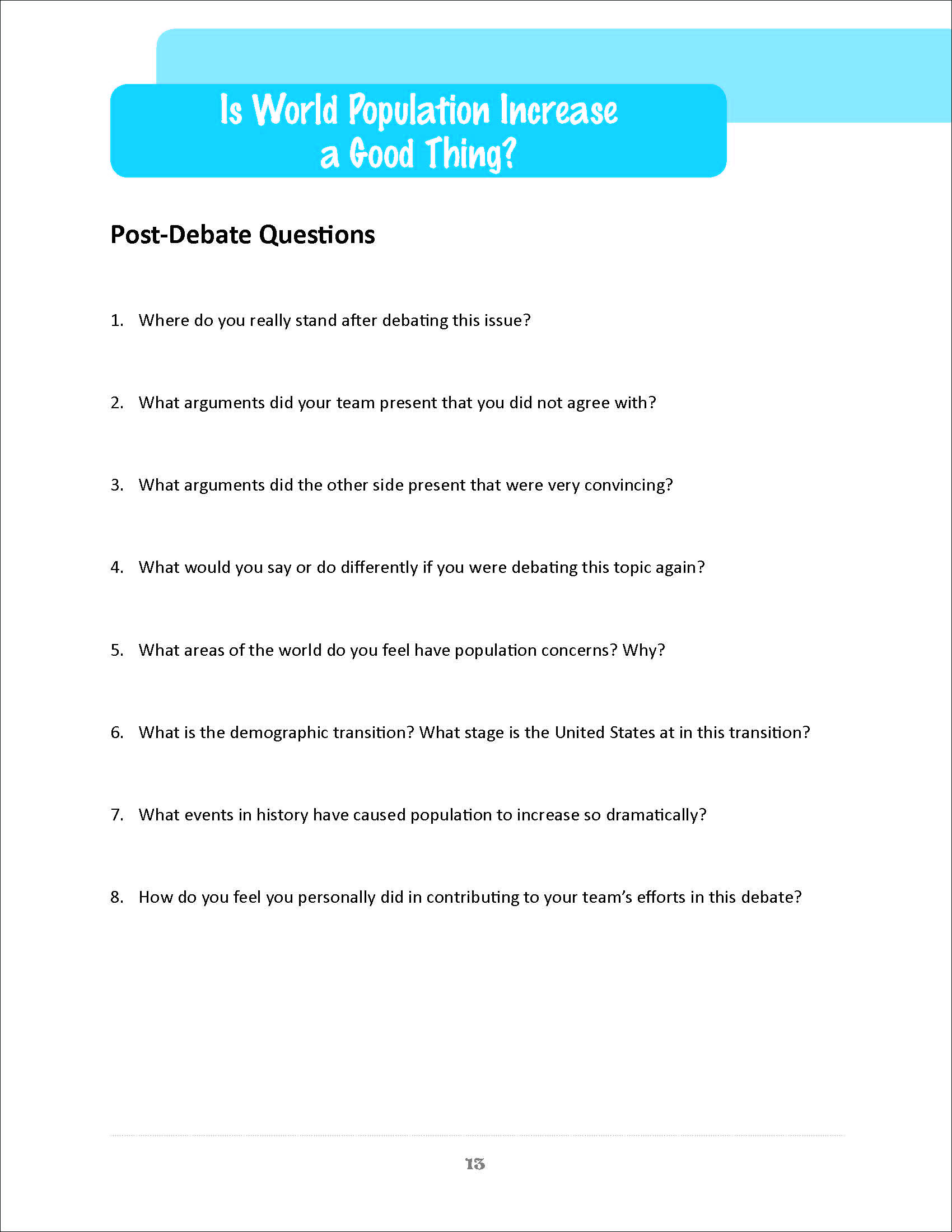 Initiate Student Debates Stimulate Interest, Teamwork, and Participation Increase Knowledge and ConfidenceThere’s nothing like introducing an argument to get students involved with the topics you’re teaching. Framing these subjects in a debate format helps them get invested and form a passion for research and learning outside the classroom.The debate format in this book gets the whole class involved in the discussion in a fun and challenging way–way better than a lecture! These debates are all high school appropriate, and will help you stimulate discussions and improve the involvement of your students.Topics range across subjects such as: political and economic systems, climate, geography, cartography, and much more. Of course, debates are not limited to the topics in this book–once you have the format down, you can create your own debate subjects!Enclosed you will find ready-to-use debate lessons for your students, as well as different debating styles, a scoring rubric, and ideas on how to expand and extend each debate. Follow-up questions are also included for each topic, to ensure that each student truly comes away from the debate with a well-rounded knowledge of the subject.Copyright 2014. High school. Reproducible. 45 pages.span style=”color:#FF0000;”Download the free “Easy Debates with Zoom Online Instructional Sheet” and sample chapter located in “Additional Info.”/spanBook Download: PDF.Adobe Reader required to view PDF.Print Book: Spiral-bound. 8.5 x 11 inches.img alt=”” src=”//aedownload.net/teachersdiscovery/images/Author_Caleb_Sanders.jpg” style=”float: left; border-width: 0px; border-style: solid; margin: 0px 6px; height: 150px; padding-right: 10px;” /About the AuthorCaleb Sanders has spent his time in education as a Social Studies teacher at the high school level for the last 16 years. He was recognized as one of the Arch Coal Teacher Achievement Award recipients in the state of Wyoming in 2015, and has been recognized as Teacher of the Year by his district. Caleb is the author of the Teacher’s Discovery Easy Debates /emseries and the SHOW ME Challenges and Clues/em series, as well as Creating Easy Mock Trials for Your Social Studies Classroom/em. He has created a steady stream of mock trials, debates, simulations, and other activities that he frequently uses in his classroom to engage students in lively learning. Caleb is married to Lexi Sanders, and they have three children. He loves astronomy, board games, puzzles, and collecting children’s books. His identical twin brother is his department chair at the same high school, which results in plenty of fun confusion!