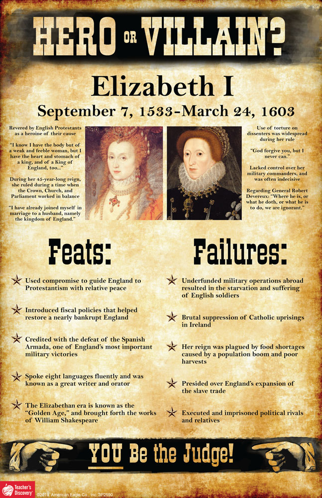 History tends to judge historical figures in extremes, and it can be tempting to view the world in black and white. Use this Elizabeth I mini-poster to encourage students to look beyond established narratives into the real world of gray.Copyright 2019. 11 x 17 inches. Cardstock.
