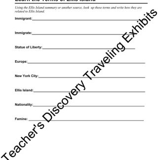 Make the most of your Ellis Island exhibit with these ready to use cross-curricular activities. This activity pack features an assortment of reproducible activities from critical thinking exercises to puzzles. Inspired by great topics, created by teachers and ready for your classroom. Copyright 2008. English. Middle School and High School levels. Reproducible. 19 pages.