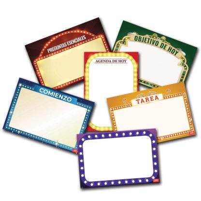 El objetivo/em, el comienzo/em, la agenda/em, la tarea/em, and las preguntas esenciales/em are the most common items that teachers have to write and update day after day in the classroom, so we made one poster for each topic. We have included one blank poster for you to use for a topic of your own choice. Having multiple posters allows you to take advantage of space and to place them in strategic locations to get students’ attention. Each poster calls out attention by design and has a heavy lamination for easy use with dry-erase markers. The agenda poster is vertical and the rest are horizontal.Copyright 2018. Six dry-erase posters. 13 x 19 inches. Laminated.Please Note…To get the longest life from your dry-erase posters:- Use only dry-erase markers.- Do not leave the same writing on the poster for weeks or months. Erase posters when they are not in use, or change what is written on them often.