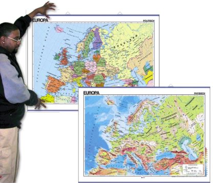 This colorful, two-sided wall map is in German and features physical characteristics on one side and political information on the other. Physical side shows mountain ranges, lakes, rivers and other geographical features. Political side shows capital and principal cities and towns. Its travel-friendly form is easily rolled and taken from room to room, with grommets for easy hanging. Map measures 54 x 38 inches. Matte, laminated stock. Made of durable, flexible, wipeable, lightweight vinyl.