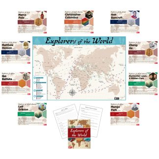 Set sail on an exploration unit featuring explorers from different continents and centuries! Students learn about each brave traveler’s nationality, reasons they explored, travel routes, achievements, and fun facts. Compare and contrast explorers in peer groups Ready-to-go reproducible activities focused on topics and people of exploration Incorporate the set throughout the year to add a personal account to the regions you teachSet includes one of each of the following: Explorers of the World Map (3M1415), Explorers of the World Mini-Poster Set (3P2669), and Explorers of the World Activity Packet Download (3P2669ADL).Map: Students follow the footsteps of the explorers and analyze the various routes of brave navigators from ancient eras, the Age of Exploration, and today. All levels. 38 x 26 inches. Laminated.Mini-Poster Set: All levels. Twenty 11 x 8.5-inch mini-posters. Card stock.Activity Packet Download: A 20-page downloadable activity packet provides over 15 activities, such as mapping early voyages, comparing explorers with Venn diagrams, and determining if an explorer is a hero or villain. All levels. PDF, 20 pages. Adobe Reader required to view PDF.