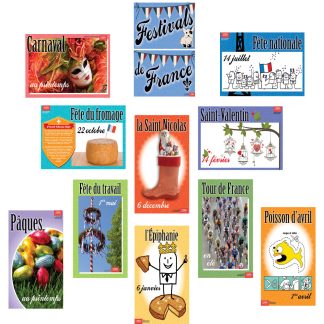 Brighten your classroom with French holidays. This bulletin board set contains nine 11 x 17-inch cards. We also included a banner and concocted a holiday so the calendar wasn’t devoid of a celebration in autumn. Copyright 2014. 11 x 17 inches. Not laminated. Cardstock.