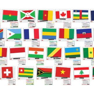 Remind your students that learning French opens them up to a host of French-speaking countries! This bulletin-board set includes the flags of 31 countries and comes with a set of corresponding trivia cards that reveal fascinating facts about each flag’s origins and history. Your students will learn how widespread the French language is–and important historical, cultural, and geographical facts about French-speaking nations. A colorful addition to your world language classroom, which celebrates diversity and promotes cultural awareness.Copyright 2015. French/English. Thirty-one 11 x 9-inch flag cards and thirty-one 7 x 5-inch “Did You Know?” info cards. Cardstock.