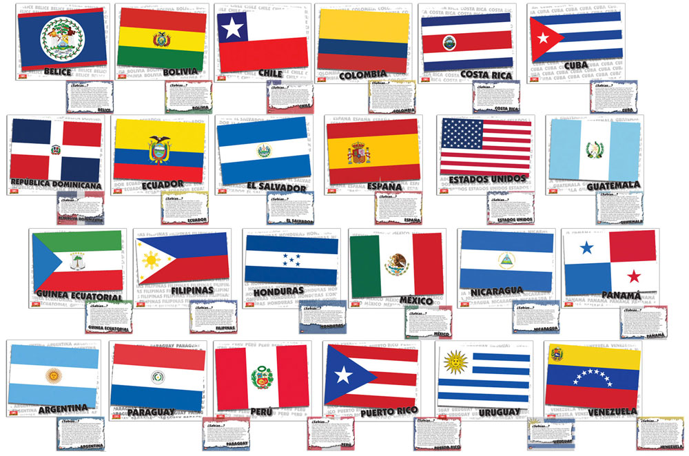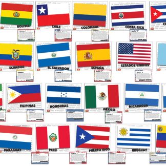 Remind your students that learning Spanish opens them up to a host of Spanish-speaking countries! This bulletin-board set includes the flags of 24 countries and comes with a set of corresponding trivia cards which reveal fascinating facts about each flag’s origins and history. Students learn how widespread the Spanish language is–and important historical, cultural, and geographical facts about Spanish-speaking nations. A colorful addition to your foreign-language classroom which celebrates diversity and promotes cultural awareness. Copyright 2015. Spanish, English. Twenty-four 12 x 9-inch flag cards and twenty-four 7 x 5-inch “Did you Know” info cards, Cardstock.