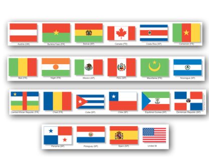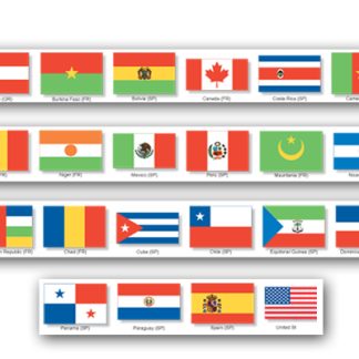 Thirty-nine feet of borders depicting 42 different country flags. Border is two inches wide. Each flag is labeled with the country name and language spoken (Spanish/French/German).Note: Borders do not reflect the recent change to the Mauritania flag.
