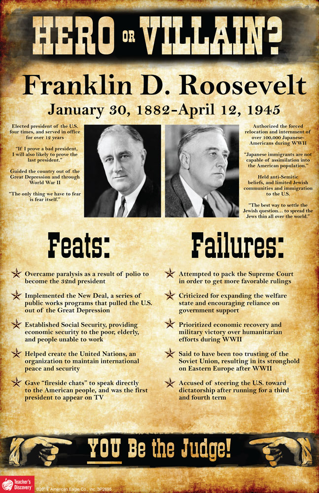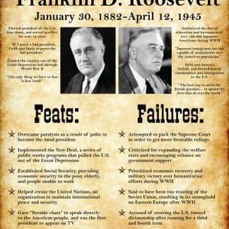 History tends to judge historical figures in extremes, and it can be tempting to view the world in black and white. Use this Franklin D. Roosevelt mini-poster to encourage students to look beyond established narratives into the real world of gray.Copyright 2019. 11 x 17 inches. Cardstock.