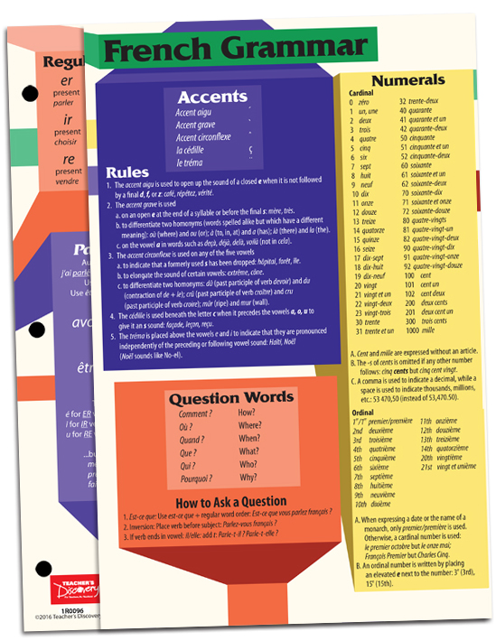 html head title/title /head body Grammar card with quickfirst-year grammar tips. 11 x 16 inches unfolded, 11 x 8 inches folded. Three-hole punch to fit in a three-ring binder. Copyright 2016. Coated heavy cardstock.English, French. All levels. /body/html