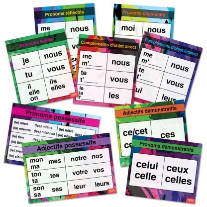 Put these charts on the wall to help students locate the proper pronouns and adjectives. 100% French. Bold, easy-to-read text. Bright backgrounds visually “link” related charts. Cardstock. Seven posters are 13 x 15 inches, two are 13 x 19 inches.
