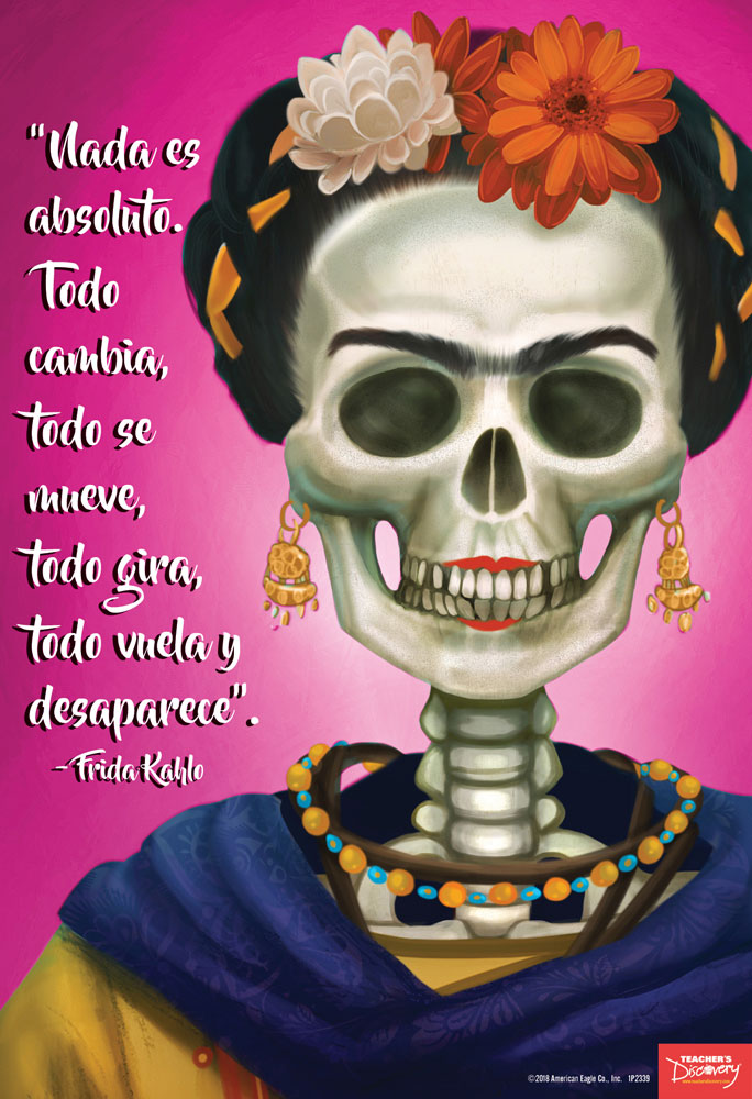 Frida Kahlo was proud of her Mexican heritage and often represented the D;iacute;a de los Muertos /emholiday symbolically in her paintings. This poster is a great way to start a discussion about the holiday and Kahlo’s perspective of her heritage, as shown in her art.13 x 19 inches. Printed in color on heavy cardstock.
