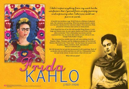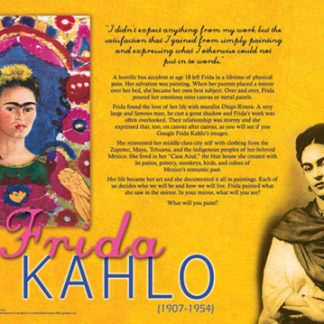 span style=”font-size: medium; color: #ff0000;”$479 per week/spanIntroduce your students to Frida Kahlo, the magnificent artist of Mexico. Yes, she was married to Diego Rivera, but Frida Kahlo was a gifted artist in her own right. Her self-portraits express what words could not and her art celebrates the colorful culture of Mexico.This exhibit includes 4 panels, each 6.5 feet tall and 4 feet wide, and a hanging center panel, 6 feet wide and 5.5 feet tall. Lightweight, versatile, and incredibly vibrant! Paintings included are Self-portrait with Hair Down and Self-portrait with Monkeys, both set on a backdrop of her beloved Casa Azul. Other panels include: The Bus, Frida and Diego Rivera, Self-portait as Tehuana, and The Frame. The large panel is designed to be hung from a drop ceiling and the smaller panels hang on a wall with provided wall hooks and adhesives.spanAll prices include rental, shipping, handling and return shipping./spanbr /span1 week $479/spanbr /span2 weeks $799/spanbr /span3 weeks $1,199/spanbr /span4 weeks $1,499/spanbr /span7 weeks $1,999 /spanbr /span/spanbr /span>eed a longer rental? Call for pricing at (248)276-4913./spanspanspanThis exhibit includes:br //span/span5 vinyl panels total: 4 panels, each 4 x 6.5 feet, 1 hanging panel, 8 x 5.5 feetLightweight hardware to hanging panel from any drop ceilingPrintable signs, exhibit information, and easy to use press kitHanging and re-packing instructionsShipping BOTH waysbr /Reserve this exhibit online by visiting a “http://www.travelingexhibits.org/exhibits/frida-kahlo-traveling-exhibit-p1249w/” target=”_blank”travelingexhibits.org/a.
