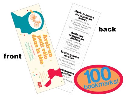 p style=”margin-bottom: 0in;”Give your students a peek into the colorful world of French idiomatic speech that’s sure to produce smiles! Each bookmark in the set features the same five French idioms, and the literal translation and English equivalent of each. Bookmarks measure 2 x 6 inches. Glossy full color on the front, black and white on the back. Package of 100. Cardstock.