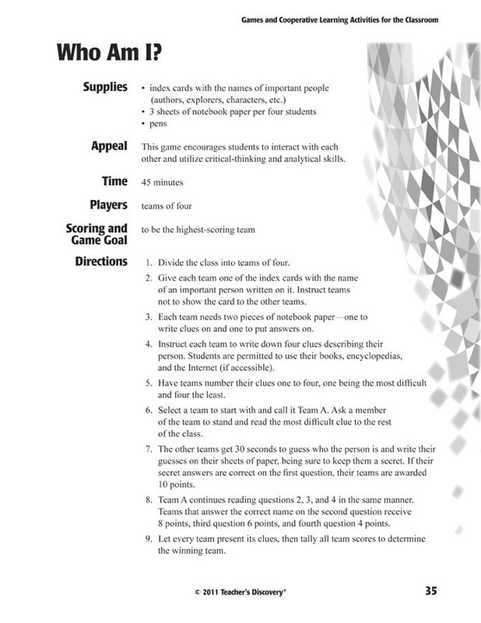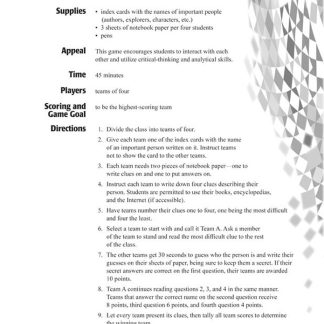 Games and Cooperative Learning Activities for the Classroomis an essential resource for every foreign language teacher! This book includes the instructions and educational benefits for games such as “Tic-Tac-Toe”, “The Memory Game” and “Football.” Authors Lisa Moore and Eva White wrote this book with teachers and students in mind!Copyright 2011. English. All levels. Middle school, high school. Reproducible. 96 pages.Book Download: PDF. Adobe Reader required to view PDF.Print Book: Spiral-bound. 8 x 11 inches.