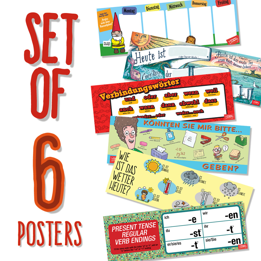 Hang these posters above your whiteboard, over the window or door, anywhere you have room, and keep them up year-round–they cover useful topics that students will look to again and again! German. All levels. 13 x 38 inches. Laminated. Dry-erase markers sold separately.Set includes:1P1813 Week German Homework Chart1P1814 Regular Verb Endings German Poster1P1815 Today’s Date German Poster1P1816 Linking Words German Poster1P1817 ;ldquo;Ask for It in German;rdquo; Poster1P1818 The Weather Today German Poster