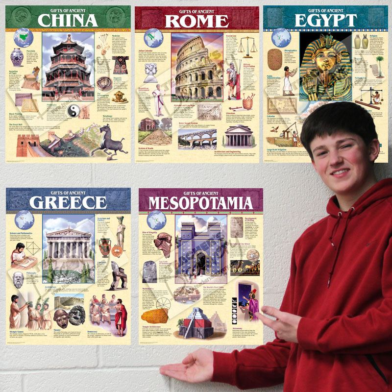 Gifts of Mesopotamia, Rome, Ancient Greece, Ancient Egypt, and Ancient China!Which civilization gave us what?Information at a glance, plus a timeline at the bottom of each poster. Great decor when teaching ancient civilizations.Includes:AlphabetMilitary organizationThe calendarPhilosophyPorcelainAstronomySilksMathematicsCode of Hammurabi, and more!divUpdated Copyright 2006, 5 charts, 17 x 21 inches each, heavy card stock, middle school./div