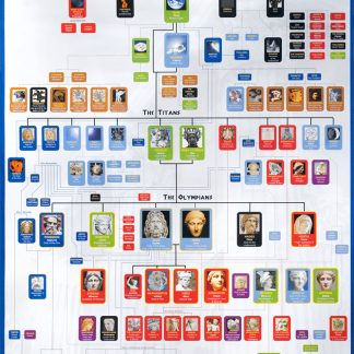 Any fans of Riordan’s Percy Jackson /embooks will love this chart! It features both the Greek and Roman names for the gods, as well as their titles and functions. It covers three generations: the primordial gods, the Titans, and the Olympians. It is also color-coded to differentiate between sea gods, sky gods, earth gods, underworld gods, personifications, monsters, demigods, and mortals. The color-coded lines also clarify the gods’ lineages. Includes over 100 names and over 80 images!Copyright 2014. 24 x 36 inches. Laminated.