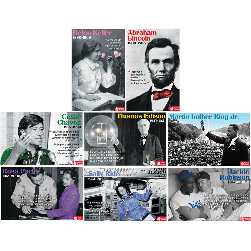 Hero: A hero is someone celebrated for their qualities or great achievements. Empower your students with posters featuring eight heroic Americans. Cesar Chavez Thomas Edison Helen Keller Martin Luther King Jr. Abraham Lincoln Rosa Parks Sally Ride Jackie RobinsonEight 11 x 17-inch posters. Cardstock. All levels.