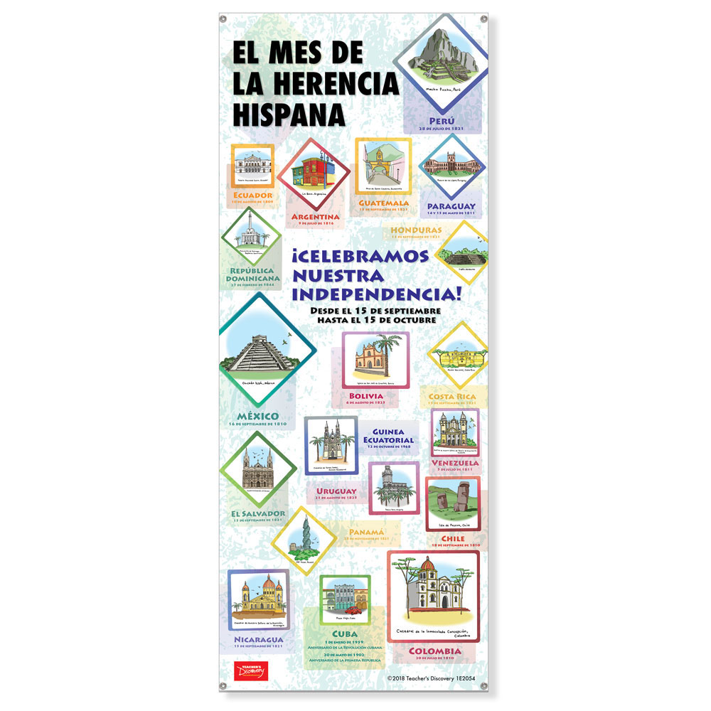 ;iexcl;Viva la independencia!/em Do you know when each country’s independence day is? Every year, Latinos celebrate Hispanic Heritage Month from September 15 through October 15. This banner displays a well-known icon from each country, hand-drawn by the artist SnapHappySmith. Under each country, you will see the date each celebrates their independence. Great buy: Because the dates don’t change, you can use this poster from year to year! Note: Some countries had a few independence days. We chose to include the major holiday celebrated there, but are not discounting the importance of the others.Vinyl banner with four grommets. 2 x 5 feet.