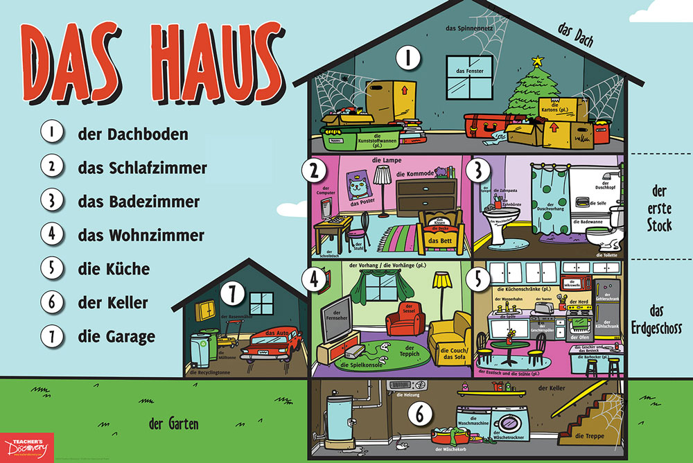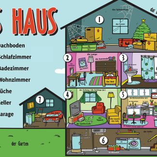 All-German chart shows the rooms of a house and the objects in them. Copyright 2018. 36 x 24 inches. Laminated.