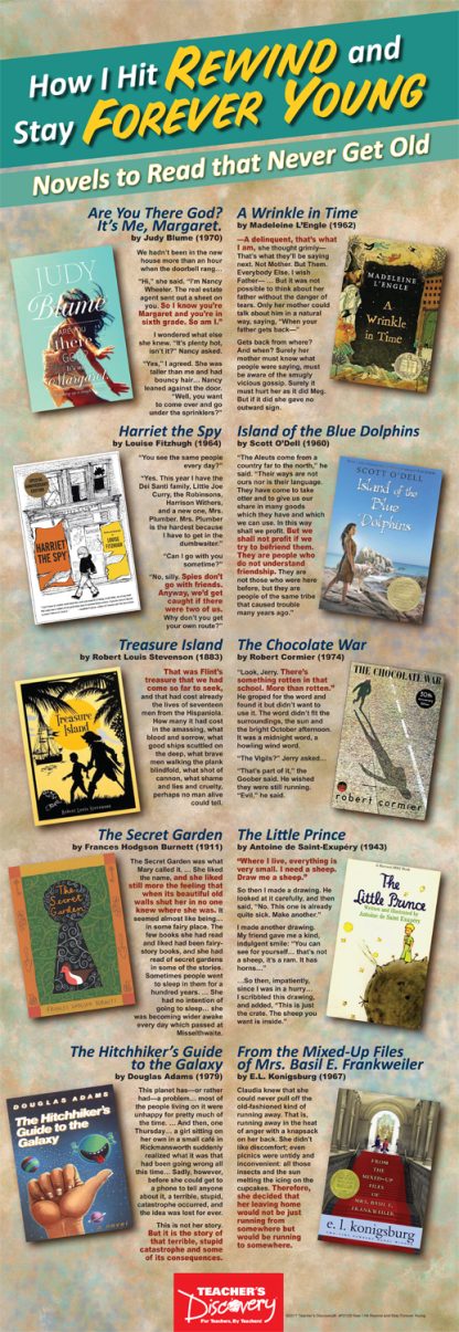 Relive your literary childhood and excite your students about reading with this young adult novel poster featuring stories that never get old! Each timeless novel has been read, loved, and passed down from generation to generation. After reading the preview text from 10 novels, your students will be longing to pick up the book and discover what happens next just like you did! This poster is a perfect addition to your classroom library or reader’s workshop.Featured Titles and Authors Are You There God? It’s Me, Margaret./em by Judy Blume A Wrinkle in Time /emby Madeleine L’Engle Harriet the Spy/em by Louise Fitzhugh Island of the Blue Dolphins/em by Scott O’Dell Treasure Island/em by Robert Louis Stevenson The Chocolate War/em by Robert Cormier The Secret Garden/em by Frances Hodgson Burnett The Little Prince /emby Antoine de Saint-Exupery The Hitchhiker’s Guide to the Galaxy/em by Scott Westerfeld From the Mixed-Up Files of Mrs. Basil E. Frankweiler/em by E. L. KonigsburgCopyright 2017. 13 x 38 inches. Laminated.