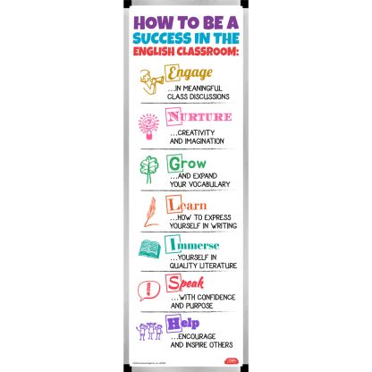 Welcome your students into your English classroom. This banner is ideal for encouraging students and fostering a positive learning environment from the start of the year and throughout. It is made from durable, professional-grade vinyl that will last year after year. It easily hangs on a door or a wall with double-sided tape or mounting tape.Copyright 2019. Middle school, high school. 2 x 6 feet. Durable, lightweight vinyl.