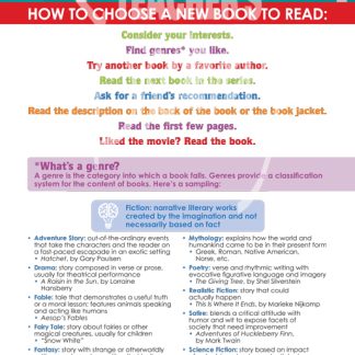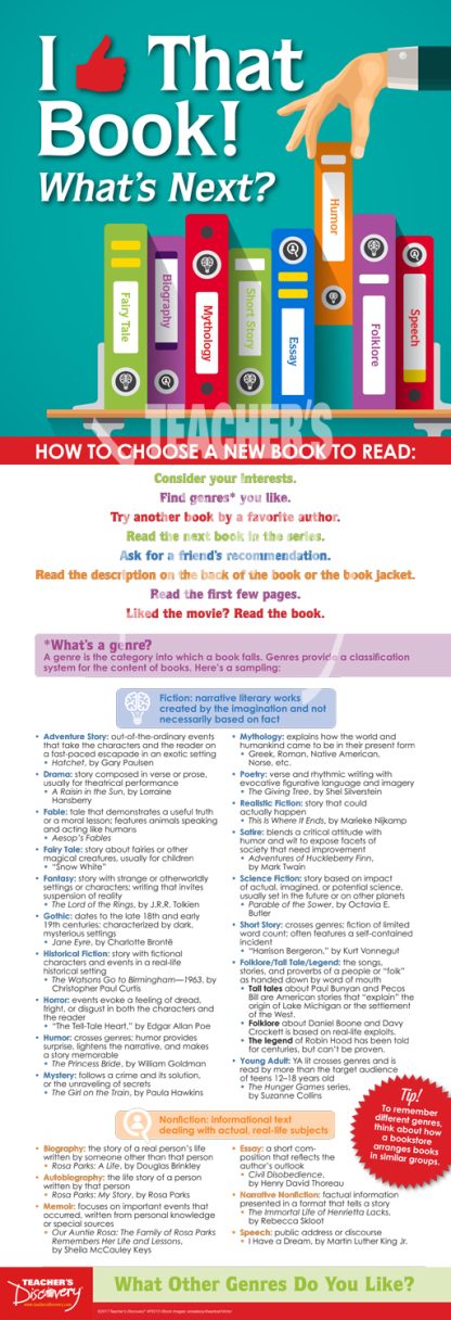 When your students ask, “What should I read next?” simply point them to the tips for choosing a new book on this poster. Genres are explained with examples and they can use the samples as a springboard for discussion of their favorites.Copyright 2017. 13 x 38 inches. Laminated.