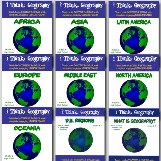 Each of these units examines one region of the world and include a variety of engaging, student-centered activities examining a wide assortment of regional issues through the lens of the five themes of geography. All consist of a minimum of 15 complete and easy-to-use lesson plans including a culminating research project along with study guides and differentiated tests. Like all InspirEd materials, they incorporate critical and creative thinking, test-taking skills, reading and writing in the content area, and much more!Set includes one of each of the following books: I Think: Geography, Asia I Think: Geography, Africa I Think: Geography, Latin America I Think: Geography, Oceania I Think: Geography, Middle East I Think: Geography, Europe I Think: Geography, North America I Think: Geography, U.S. Regions I Think: Geography, What Is Geography?Copyright 2008. Middle school, high school. Set of nine books. 100+ pages each.Book Downloads: PDFs. Adobe Reader required to view PDF.Print Books: Softcover, 8 x 11 inches.