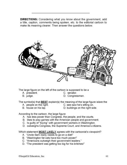 A variety of engaging, student-centered activities and lesson plans examine the U.S. Executive Branch. This unit consists of complete and easy-to-use lesson plans along with study guides and differentiated tests. Like all InspirEd materials, they incorporate critical and creative thinking, test-taking skills, reading and writing in the content area, and much more!Includes: Presidential responsibilities Qualifications for the job The Electoral College The Vice President Executive departments Civil service jobs State of the Union Checks and balances Foreign policyand more!Copyright 2008. Middle school, high school. Reproducible. 96 pages.Book Download: PDF. Adobe Reader required to view PDF.Print Book: Softcover, 8 x 11 inches.