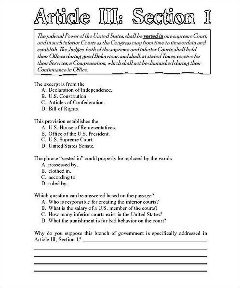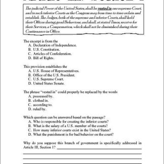 Subject matter includes federal jurisdiction, structure of the judiciary, the Supreme Court, judicial review, landmark cases, judicial independence, the First Amendment, rights of the accused, juvenile justice, civil rights cases, and more.Copyright 2009. Middle school, high school. Reproducible. 98 pages.Book Download: PDF. Adobe Reader required to view PDF.Print Book: Softcover, 8 x 11 inches.