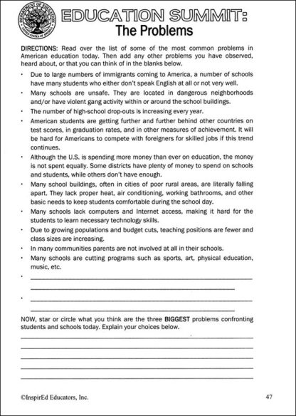 A variety of engaging, student-centered activities and lesson plans examine the 21st century. This unit consists of complete and easy-to-use lesson plans along with study guides and differentiated tests. Like all InspirEd materials, they incorporate critical and creative thinking, test-taking skills, reading and writing in the content area, and more.Includes: President Clinton President George W. Bush 9-11 Immigration Education Civil rights Politics and much more!Copyright 2011. Middle school, high school. Reproducible. 98 pages.Book Download: PDF. Adobe Reader required to view PDF.Print Book: Softcover, 8 x 11 inches.