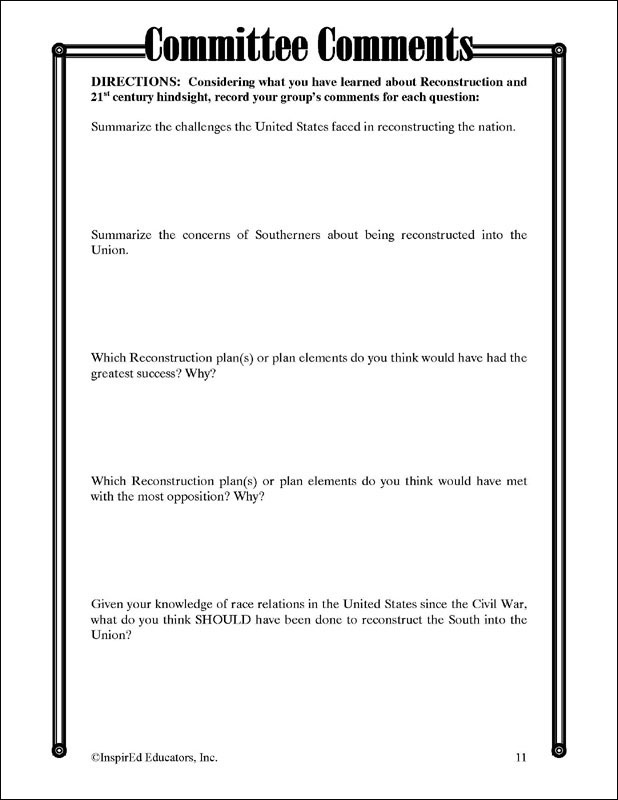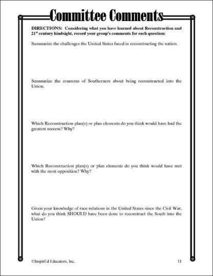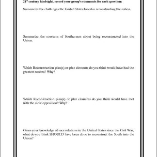 A variety of engaging, student-centered activities and lesson plans examine the U.S. Reconstruction Era. This unit consists of complete and easy-to-use lesson plans along with study guides and differentiated tests. Like all InspirEd materials, they incorporate critical and creative thinking, test-taking skills, reading and writing in the content area, and much more!Includes: Freedmen;#39;s rights Sharecropping Southern resistance Civil rights abuses Impeachment of Andrew Johnson Discrimination The transcontinental railroad Native Americans Alaska purchase Political corruption and more!Copyright 2008. Middle school, high school. Reproducible. 104 pages.Book Download: PDF. Adobe Reader required to view PDF.Print Book: Softcover, 8 x 11 inches.