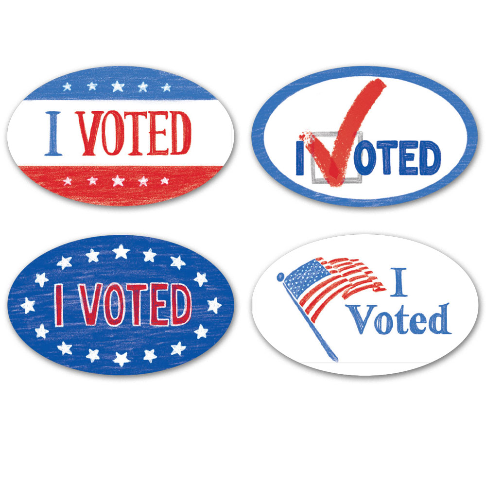 Voting stickers are a badge of civic pride. Whether your students vote in mock elections or for student council and club officers, make sure they have a sticker to prove it!Four sheets, 128 total stickers. Approx. two inches.