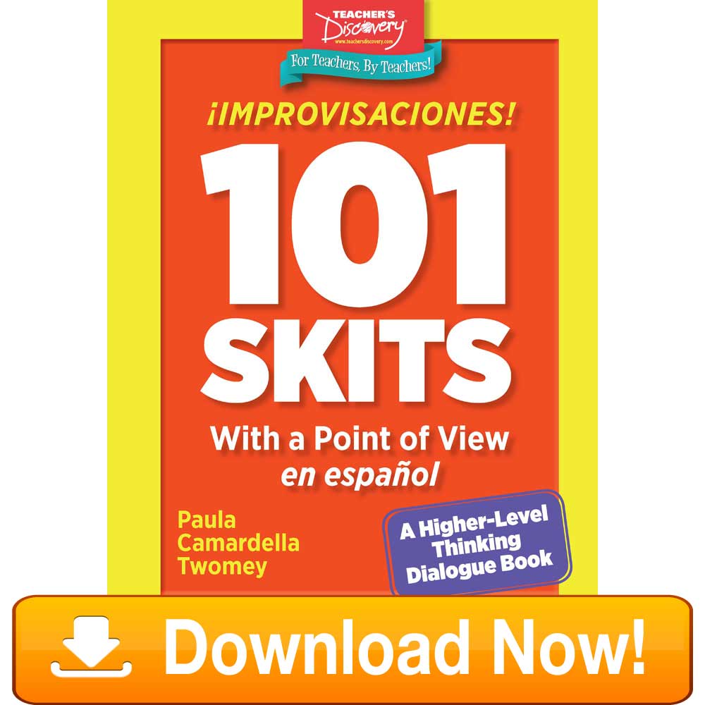 With ;iexcl;Improvisaciones!/em each student adopts a persona with a point of view and participates in a dialogue in the target language. ;iexcl;Improvisaciones!/em gets students using higher-level thinking skills while developing new vocabulary and grammatical structures. The common core standards support these critical thinking skills. With that in mind, each improvisation has a reflection component that invites students to make a personal connection to the activity.Copyright 2015. Spanish, English. Middle school, high school. Reproducible.104 pages.Book Download: PDF. Adobe Reader required to view PDF.Print Book: Spiral-bound. 8 x 11 inches.img alt=”” src=”//aedownload.net/teachersdiscovery/images/Author_Paula_Twomey_Sachuaman_Peru.jpg” style=”float: left; border-width: 0px; border-style: solid; margin: 0px 6px; height: 160px; padding-right: 10px;” /About the AuthorPaula Twomey/ is a Rockefeller Fellow, has a BA from SUNY Albany and an MA from Middlebury College, and is currently an adjunct instructor at Ithaca College. After 31 years in the classroom, Paula still enjoys teaching, traveling, mentoring, writing curriculum, authoring books, and giving advice!
