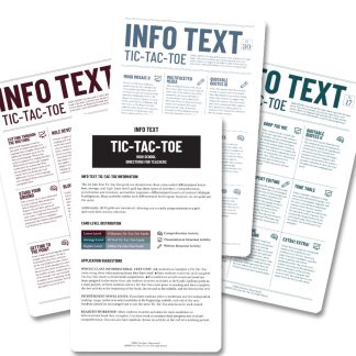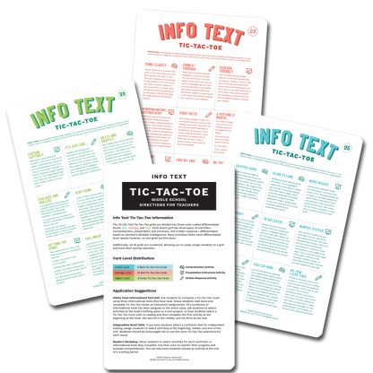 Total of 50 activities spanning 35 Tic-Tac-Toe cards excite every student and work with any nonfiction text. Many activities within each differentiated level repeat, but no two cards are the same. Set includes enough cards for oversized classes. Info Text Tic-Tac-Toe is perfect for energizing your informational text unit.Info Text Tic-Tac-Toe provides differentiation three ways: Readiness: Three color-coded levels of difficulty Interest: Students choose which three adjacent activities to complete. Learning Preference: Activities include a variety of learning styles.Card Set includes: Lower Level: 8 Teal Cards Average Level: 19 Coral Cards Higher Level: 8 Green Cards Directions for Teachers Card with suggested usesCopyright 2018. 36 cards. 7 x 11 inches. Laminated cardstock.