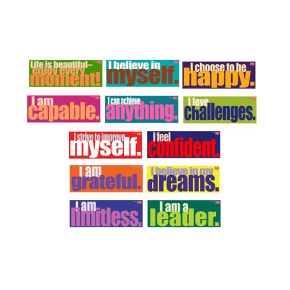 Help your students be positive with 12 Inspired Minds classroom signs. Each sign includes a different affirmation–;ldquo;I choose to be happy,;rdquo; ;ldquo;I am limitless,;rdquo; plus 10 more. Hang them all over your room, and create a nurturing, hopeful atmosphere in your classroom. Set of 12 signs. 19 x 7 inches. Cardstock. Not laminated.