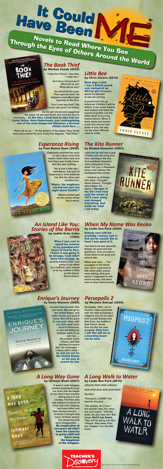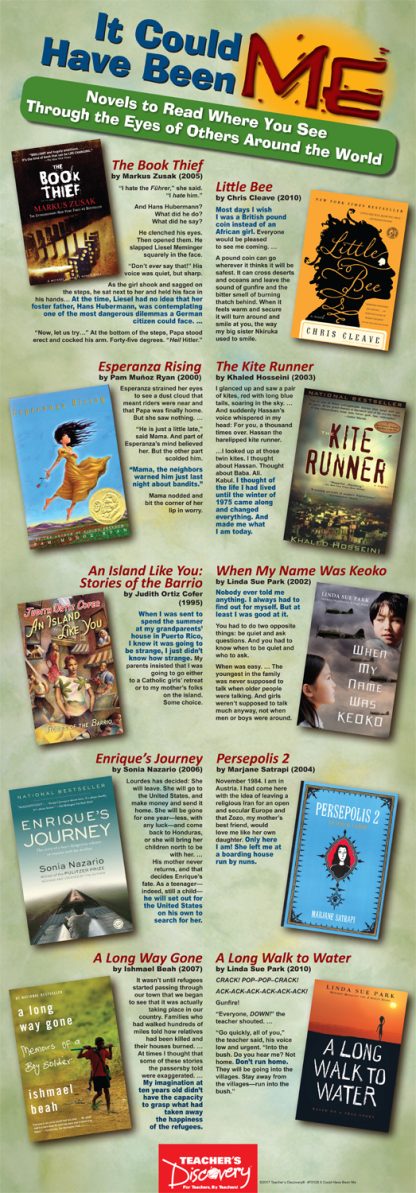 Excite your students about reading with this young adult and modern novel poster with stories from all over the world. Each featured novel will widen your students’ global perspective as they read about the often unimaginable difficulties that the characters face. After reading the preview text from 10 novels, your students will be longing to pick up the book and discover what happens next! This poster is a perfect addition to your classroom library or reader’s workshop.Featured Titles and Authors Little Bee/em by Chris Cleave The Book Thief/em by Markus Zusak The Kite Runner /emby Khaled Hosseini A Long Walk to Water/em by Linda Sue Park An Island Like You: Stories of the Barrio /emby Judith Ortiz Cofer Enrique’s Journey/em by Sonia Nazario Persepolis 2/em by Marjane Satrapi A Long Way Gone/em by Ishmael Beah Esperanza Rising /emby Pam Mutilde;oz Ryan When My Name Was Keoko /emby Judith Ortiz CoferCopyright 2017. 13 x 38 inches. Laminated.a name=”_GoBack”/a4P2128 It Could Have Been Me Poster $12.00