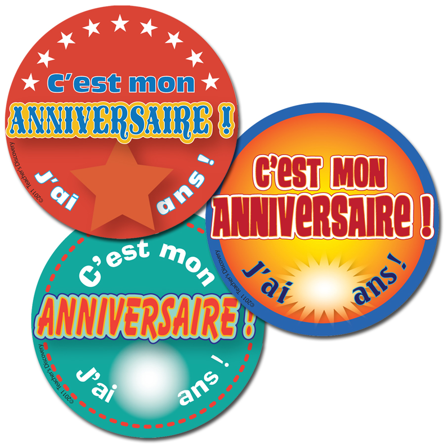 p style=”margin-bottom: 0in;”Your French students can tell the world it’s their birthday with these great stickers! They have light adhesive so they are safe to wear on most fabrics, with a place for the student to write in his/her age. Each sticker is over two inches across. Roll of 90 stickers in three assorted colorful designs.