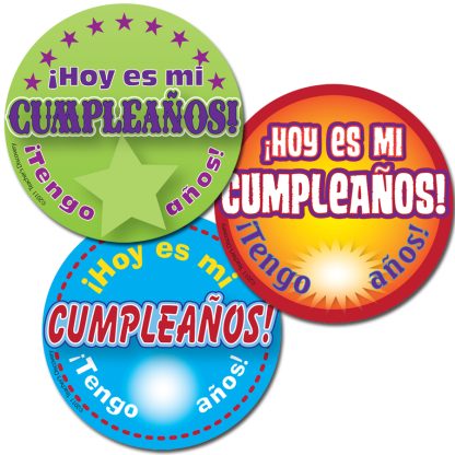 p style=”margin-bottom: 0in;”Your Spanish students can tell the world it’s their birthday with these great stickers! They have light adhesive so they are safe to wear on most fabrics, with a place for the student to write in his/her age. Each sticker is over two inches across. Roll of 90 stickers in three assorted colorful designs.
