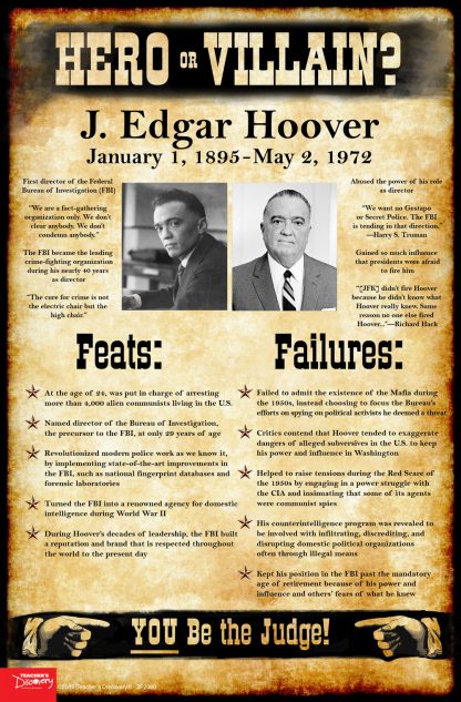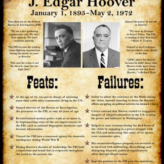 History tends to judge our past leaders as extremes: Abraham Lincoln was an American hero! Benedict Arnold was a traitor! As teachers, it’s tempting at times to present a world as black and white to our students: good or evil, friend or foe, hero or villain. Use this J. Edgar Hoover mini-poster to help students take off the rose-colored glasses and see beyond the established historical narratives and into the real world of gray. Copyright 2016. 11 x 17 inches. Cardstock.