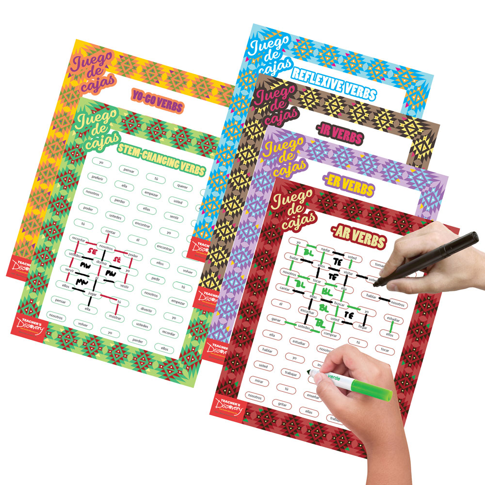 Juego de cajas/em allows students to practice their subject-verb agreements and pronunciation while channeling their competitive strategy skills! Be the first to complete a box and own it with your initials or name.The whole class plays in pairs.3 game boards/6 different gamesGames include: 15 -AR/em/-ER/em verbs dry-erase game boards 15 -IR/em/reflexive verbs dry-erase game boards 15 YO/em-GO/em/stem-changing verbs dry-erase game boardsDry-erase markers not included.span style=”color:#FF0000;”Download the game instructions located in “Additional Info.”/spanCopyright 2018. Spanish. All levels. Middle school, high school. 8 x 11 inches. Laminated.