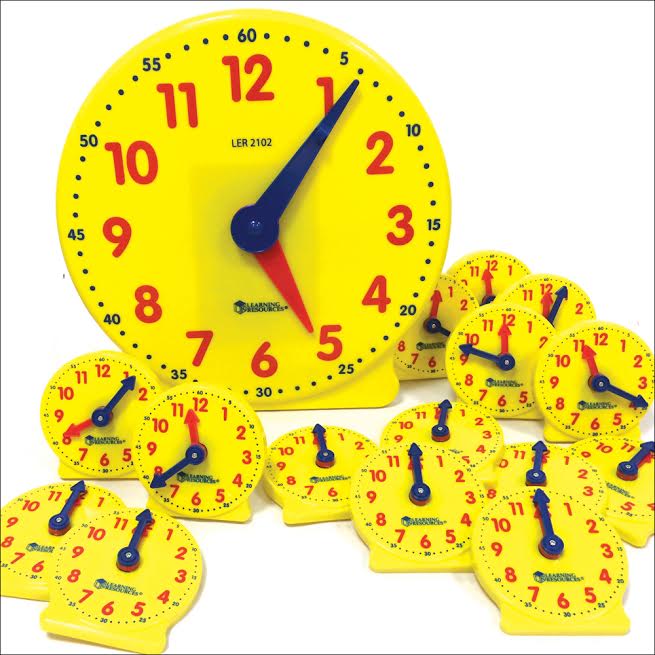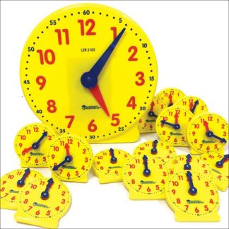Hidden gears maintain correct hour and minute relationships as you demonstrate time-telling concepts. Color-coding supports student understanding and durable, geared clock hands are designed to last!Choose from the large demonstration clock for teaching at the front of the class or mini clocks for every student. A great visual aid for students as they learn to tell and write time!Plastic Teacher’s Demonstration Clock measures 13;frac14; ;ldquo;H with easy-to-read hour (red) and minute (blue) markings, and removable stand. Plastic Student Clocks each measure 4;rdquo;H.span style=”color:#FF0000;”Buy the setand SAVE!/span