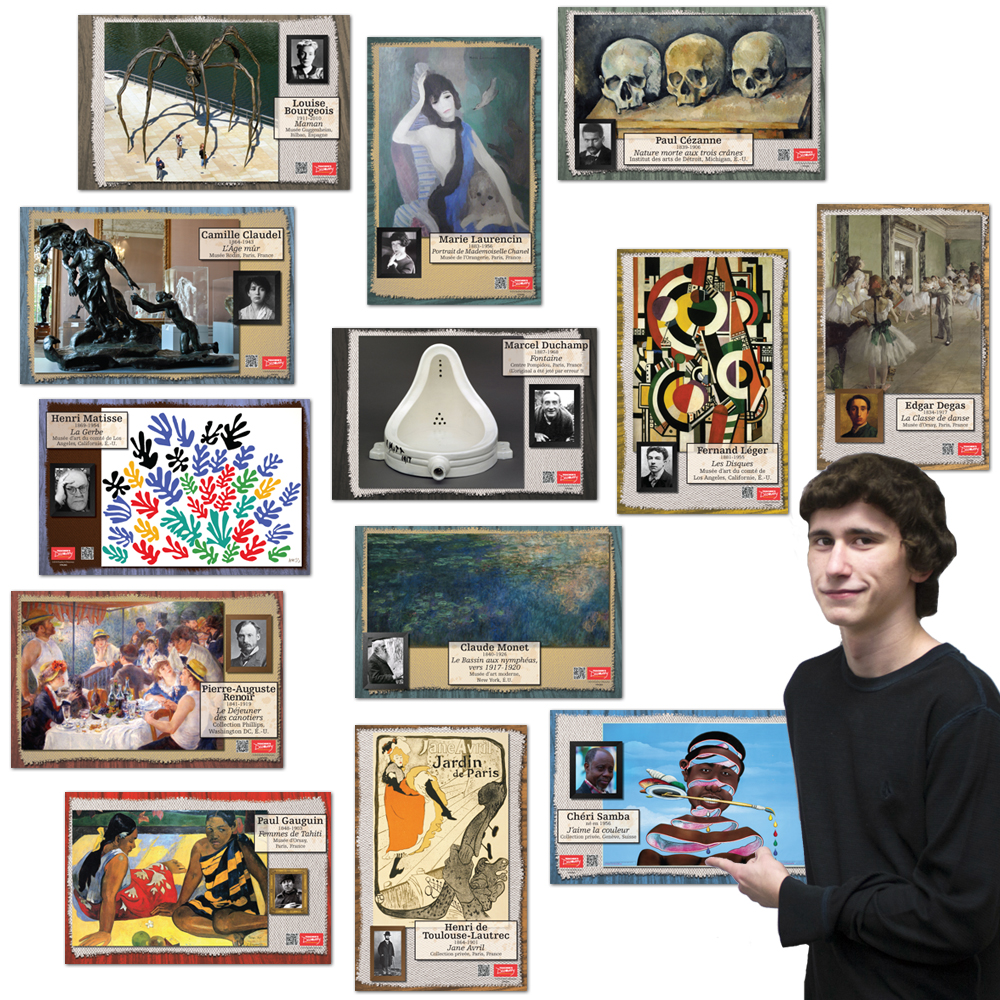 Monet, Degas, Toulouse-Latrec, Renoir and more are all in one set. Bring the greatest French artists into your classroom. Thirteen cardstock prints, 11 x 17 inches.This set contains QR codes for each artist. Students can scan the code with their smart phones for more information and pictures about each artist.