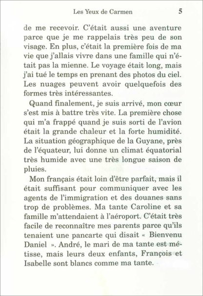 /emJe m;#39;appelle Daniel et je voudrais vous raconter une histoire… /em;raquo;/emDaniel is a 16-year-old American boy who wants to enter a photography contest. He travels to French Guyana where he visits his uncle;#39;s family and meets the intriguing Carmen with the beautiful eyes. Carmen is the perfect photo subject, but Carmen disappears…Written byVer;oacuteica Moscoso.Copyright 2007. French. Level 3. High school. 75 pages.Print Book: Softcover. 5 x 7 inches.The Audio Book is a recording of the reader text read by a native speaker.span style=”color:#FF0000;”Listen to the audio preview(s) located in “Additional Info.”/spanCopyright 2007. French. Level 3. High school. 11 tracks. 66 minutes.Audio Book Download: MP3Audio Book on CD: Audio CD.