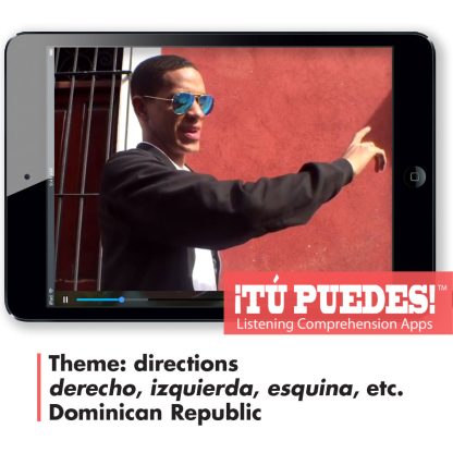 A real-world Spanish audio/visual listening clips, edited to under two minutes and accompanied by three levels of quizzes (Novice, Intermediate, and Advanced). As you listen, the clip pauses from time to time and asks the user a question. Once the question is answered, the video will resume playing. If you want you can replay the last part of the clip by pulling the video marker back. After the last question, students can review their results and send them to their teacher.Giving Directions Parody/br /Theme: directionsbr /derecho, izquierda, esquina,/ etc.br /Dominican RepublicHow it works:/br /1. You buy the app and we email the link to generate your 3 different level quiz codes.br /2. Tell your students to go to tupuedesapp.com/ on their computer or mobile device.br /3. Give your students the code for the quiz and have them do the exercise.br /4. Students press “Save and Submit” and their scores go to your results page.span style=”color: #FF3333″ To buy all 25 Listening Comprehension Apps a “https://www.teachersdiscovery.com/product/28055/spanish”click here./a//span