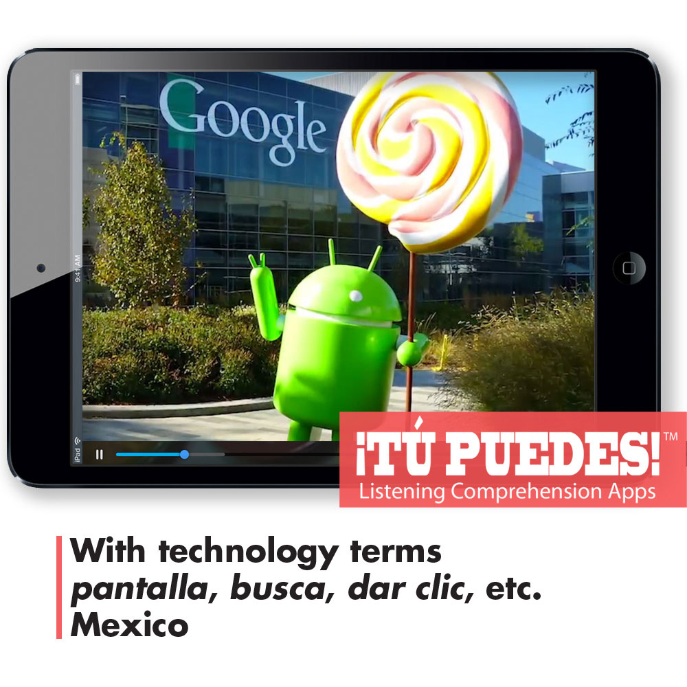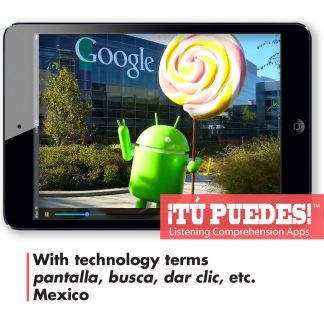 A real-world Spanish audio/visual listening clips, edited to under two minutes and accompanied by three levels of quizzes (Novice, Intermediate, and Advanced). As you listen, the clip pauses from time to time and asks the user a question. Once the question is answered, the video will resume playing. If you want you can replay the last part of the clip by pulling the video marker back. After the last question, students can review their results and send them to their teacher.Google Tricks/br /With technology termsbr /pantalla, busca, dar clic/, etc.br /MexicoHow it works:/br /1. You buy the app and we email the link to generate your 3 different level quiz codes.br /2. Tell your students to go to tupuedesapp.com/ on their computer or mobile device.br /3. Give your students the code for the quiz and have them do the exercise.br /4. Students press “Save and Submit” and their scores go to your results page.span style=”color: #FF3333″ To buy all 25 Listening Comprehension Apps a “https://www.teachersdiscovery.com/product/28055/spanish”click here./a//span