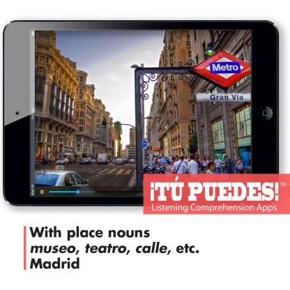 A real-world Spanish audio/visual listening clips, edited to under two minutes and accompanied by three levels of quizzes (Novice, Intermediate, and Advanced). As you listen, the clip pauses from time to time and asks the user a question. Once the question is answered, the video will resume playing. If you want you can replay the last part of the clip by pulling the video marker back. After the last question, students can review their results and send them to their teacher.Madrid Tour/br /With place nounsbr /museo, teatro, calle,/ etc.br /MadridHow it works:/br /1. You buy the app and we email the link to generate your 3 different level quiz codes.br /2. Tell your students to go to tupuedesapp.com/ on their computer or mobile device.br /3. Give your students the code for the quiz and have them do the exercise.br /4. Students press “Save and Submit” and their scores go to your results page.span style=”color: #FF3333″ To buy all 25 Listening Comprehension Apps a “https://www.teachersdiscovery.com/product/28055/spanish”click here./a//span